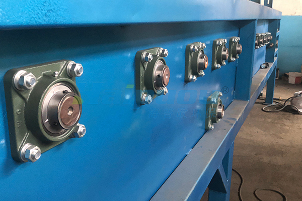2 壓榨輥系: 是由直徑由大到小順序排列的輥筒組成。污泥被上、下濾帶夾持,依次經(jīng)過壓榨輥時,在濾帶張力作用下形成一由小到大的壓力梯度,使污泥在脫水過程中所受的壓榨力不斷增高,污泥中水份逐漸脫除。